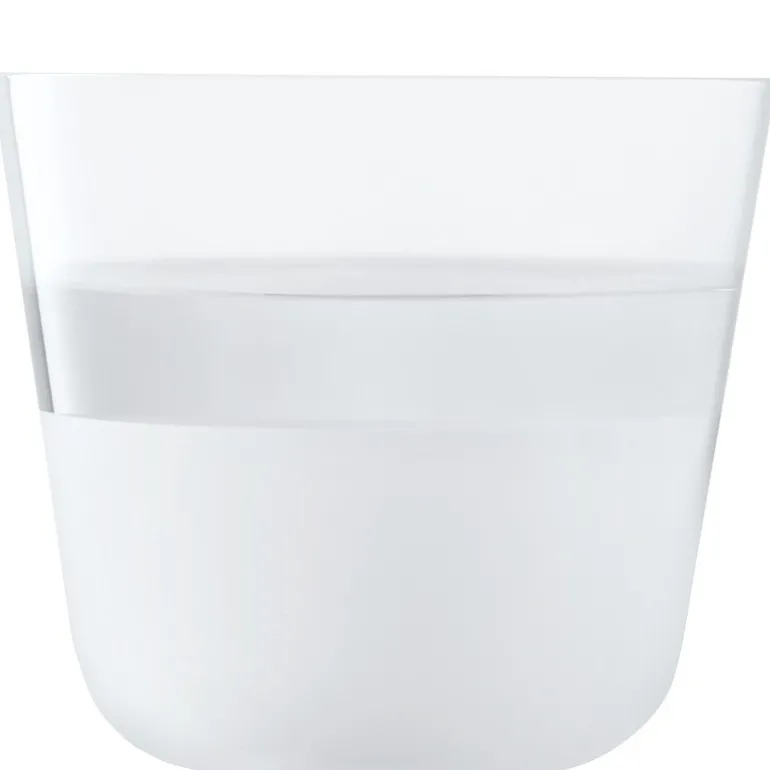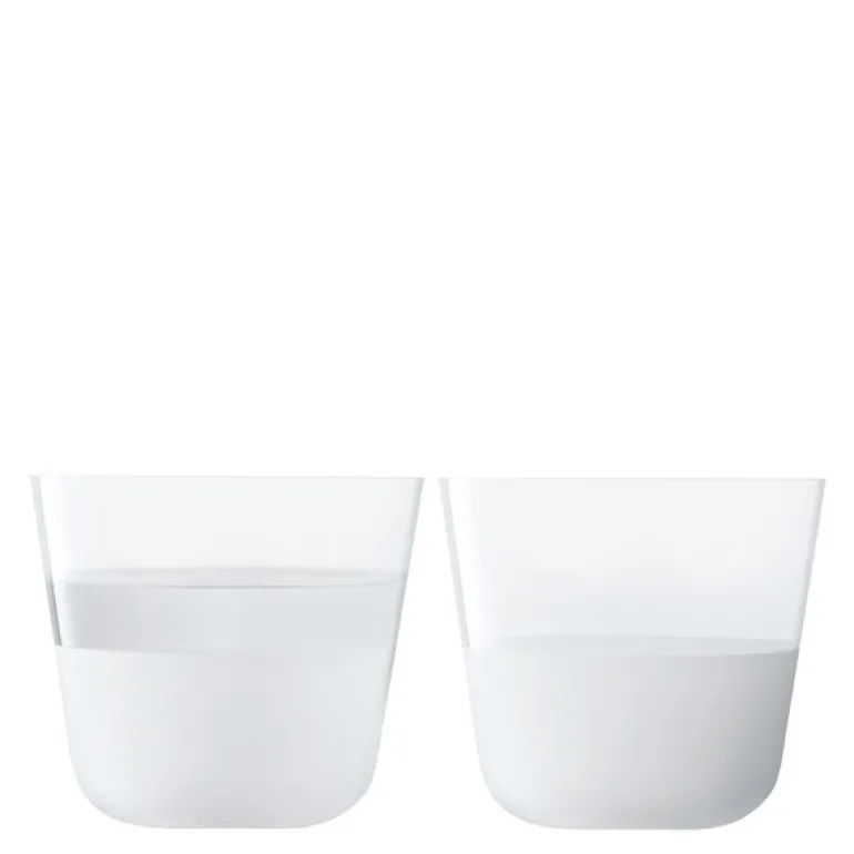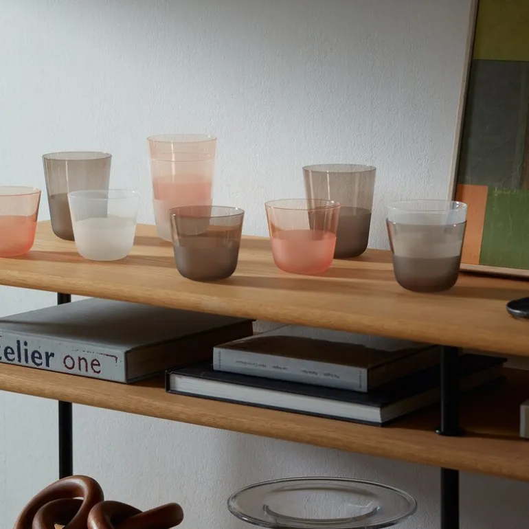 Glassene har en tydelig todelt overflate. Øvre del er laget i klart glass som fremhever innholdet, mens den nedre delen har en matt, nesten keramisk finish som tilfører et taktilt element og godt grep. Den stabelbare formen gjør dem enkle å oppbevare og gir praktisk nytteverdi i tillegg til det visuelle uttrykket.