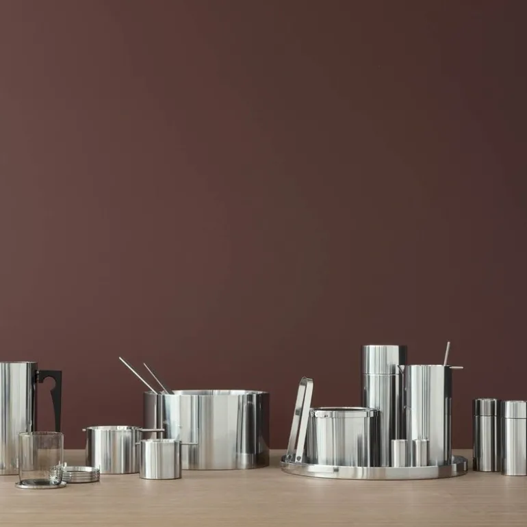 Den sylindriske formen gir et distinkt uttrykk som gjør den til et naturlig blikkfang både i baren og på spisebordet. Arne Jacobsen utviklet en komplett barserie, og denne isbøtten finnes i to størrelser – 1 liter og 2,5 liter.