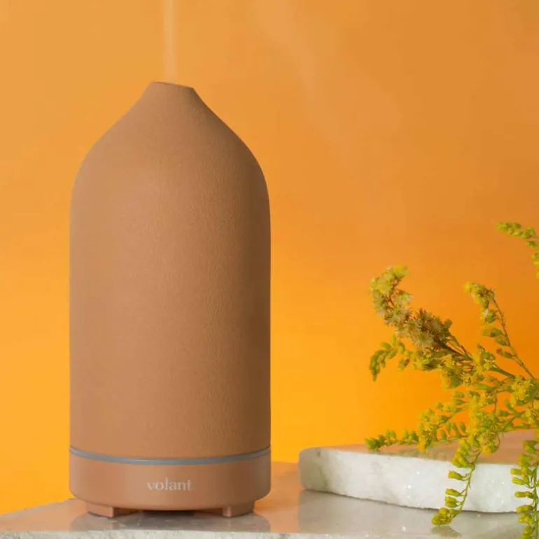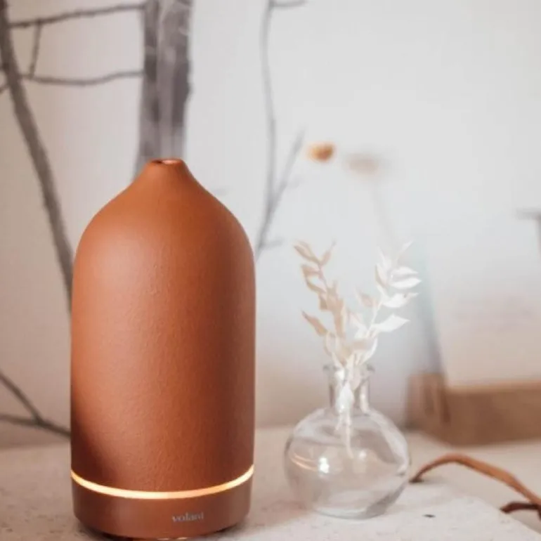 Den naturlige skjønnheten, aroma steindiffuser i matt terrakotta farge, fra Volant. Volants håndlagde steindiffuser hjelper deg å bruke eteriske oljer i hjemmet samtidig som den er minimalistisk og elegant. Den keramiske overflaten i matt sort legger til et element av high-fashion i huset uansett hvor den plasseres. Steindiffuseren er håndlagde og hver av dem er derfor unike. De er laget med 5 mm veggtykkelse og malt med bærekraftig og motstandsdyktig farge. Steindekket er vakkert matt og laget av førsteklasses porselen som vil vare i lang tid. Steindiffuseren er designet i Norge og hyller regionens naturlige former og materialer. Den prisbelønte diffuseren inneholder en liten plate som skaper en sval, forfriskende damp når den vibrerer, akkurat som dampen fra et fossefall. Denne vibrasjonen bryter ned de tilsatte eteriske oljene til mikroskopiske partikler og sprer dampen ut i luften, noe som gjør det enkelt og trygt å friske opp hjemmet ditt.