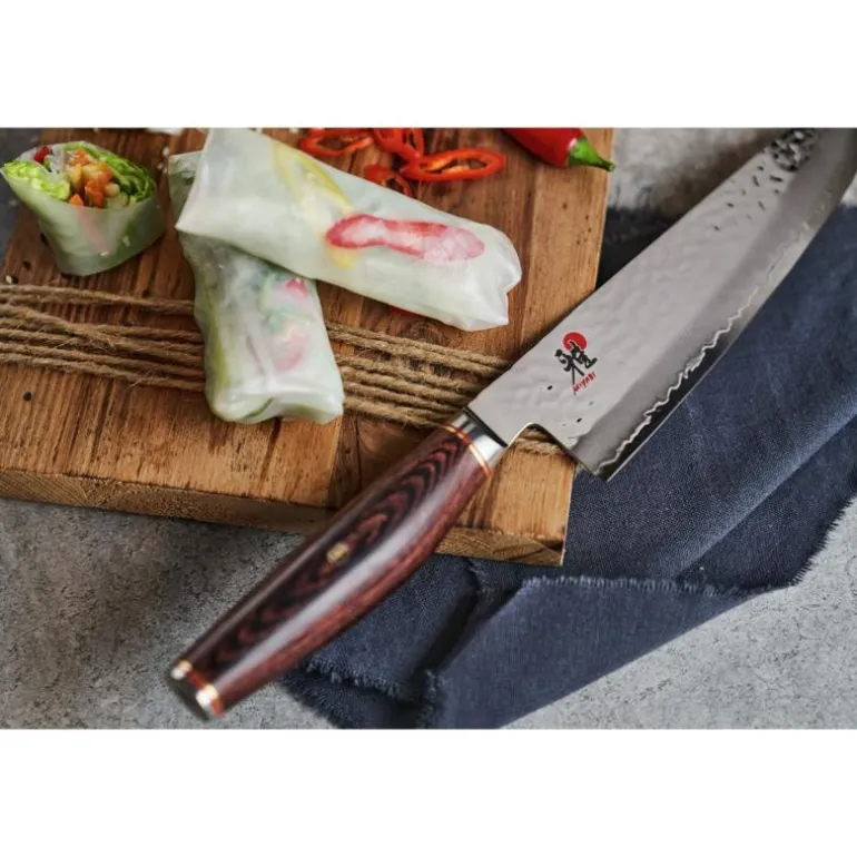 Artisan 6000 MCT har en kärna av (förädlat SG2 stål) hårt MC63 Micro Carbide pulverstål, CRYODUR® is-härdat till en hårdhet av ca. 63 HRC. Bladet är täckt med 2 lager (Tsuchime) hamrat rostfritt stål som ger kniven ett elegant utseende och förhindrar att råvaran fastnar vid användning. Slipvinkel ca: 19° och eggen är slipad enligt Honbazuke metoden. Ergonomiskt vackert handtag av Pakkawood. Livstidsgaranti på material och produktionsfel. Tillverkas till 100% i Seki, Japan. Gyutoh är japans svar på västvärldens kockkniv och kökets vanligaste kniv. Kockknivar finns i många format, typer och modeller. En kockkniv är oftast den första kniven du behöver när det kommer till köksknivar eftersom den är så väldigt mångsidig. Du kan både skiva tomater, hacka grönsaker, skära kött, fisk och mycket mer med denna modell, en riktig allround kniv. Kockknivarnas blad ska vara så högt att det går att hacka saker utan att knogarna slår i skärbrädan. Denna modell är en större rejäl modell på 24 cm och hackar/skär mer och större råvaror åt gången.