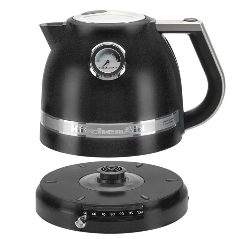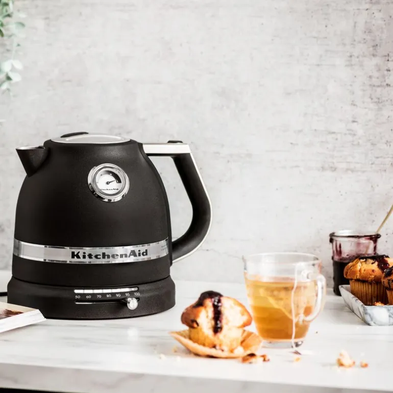 KitchenAid Artisan Vannkoker 1,5 L med termostat 5KEK1522EBK kombinerer en elegant og avrundet design med solid kvalitet. Når du holder den, merker du straks dens robusthet. Vannkokeren er utstyrt med et innebygd termometer som gir deg muligheten til å stille inn eksakt temperatur for oppvarming, fra 50°C til 100°C. Dette gjør det enkelt å oppnå ønsket temperatur for drikker eller matlaging.