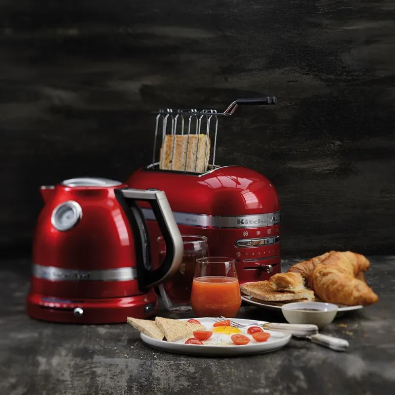 KitchenAid Artisan Vannkoker med termostat 1,5 L i fargen candy apple kombinerer et elegant og avrundet design med solid kvalitet. Når du holder den, merker du umiddelbart dens robusthet.