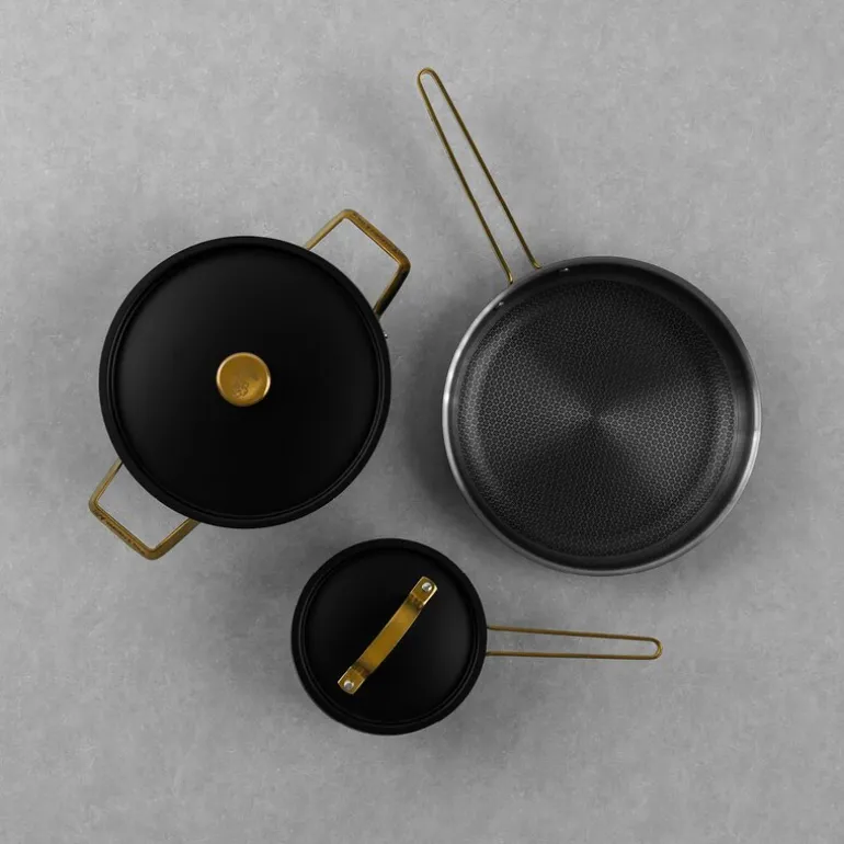 VIGGO-kjelen, med en kapasitet på 1 liter, er perfekt for tilberedning av sauser, supper og mindre porsjoner. Den har et elegant design med matt svart overflate og messingdetaljer, som gir den en klassisk og sofistikert stil. MIO-gryten, med sin kapasitet på 4 liter, er ideell for større retter som gryteretter og pasta. De varmebestandige messinghåndtakene gir et komfortabelt og trygt grep, samtidig som de tilfører et snev av luksus.