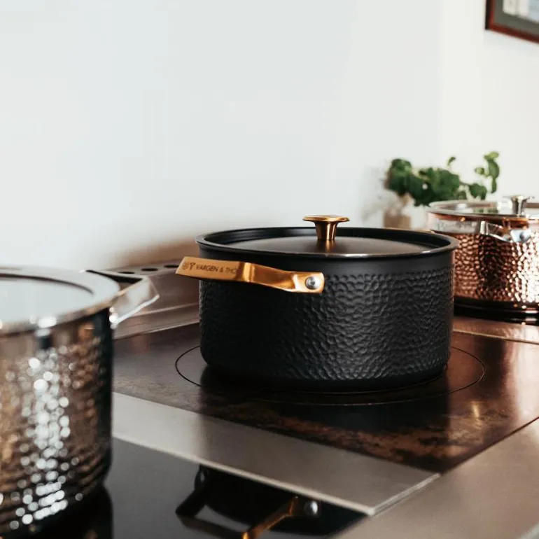 Arvet Mio kjele fra Vargen & Thor er en 4-liters gryte som kombinerer tidløs eleganse med enestående funksjonalitet. Med en unikt hamret, matt svart finish og delikate messingdetaljer, er MIO Hamret Gryte både et praktisk kjøkkenredskap og et estetisk kunstverk. Denne gryten er designet for å heve din matlaging til en ny dimensjon, og gir deg muligheten til å utforske din kulinariske lidenskap med stil og presisjon.