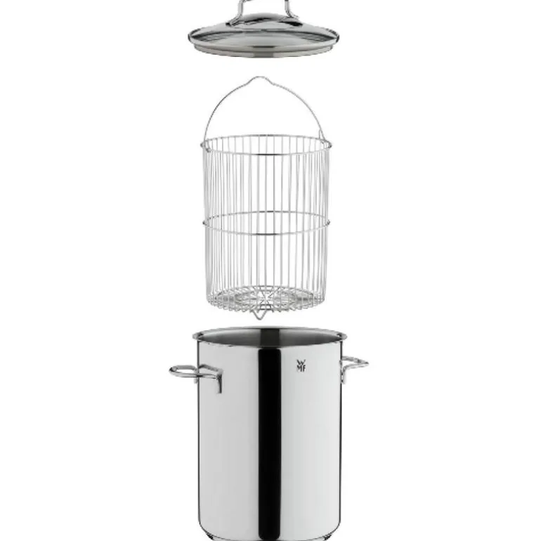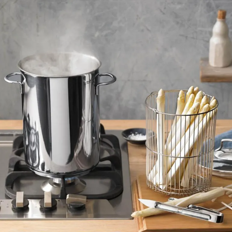 Uansett om det er hvite, lilla eller grønne asparges, så sikrer de høye kantene at aspargesen kan tilberedes perfekt i denne WMF aspargesgryten med kurvinnsats. Sylinderformen sikrer at stenglene forblir hele istedenfor å knekke under tilberedningen. Kurvinnsatsen gjør det også lett å ta ut maten når den er ferdig tilberedt. Denne funksjonen er særlig nyttig hvis du vil gjenbruke væsken til en ny tilberedning. Glasslokket gjør at du hele tiden kan følge med på tilberedningen.