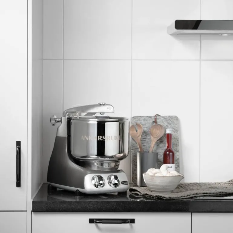 Designet på kjøkkenmaskinen i svart krom er et stilig og ikonisk design, som du gjerne kan la stå fremme på kjøkkenbenken.
