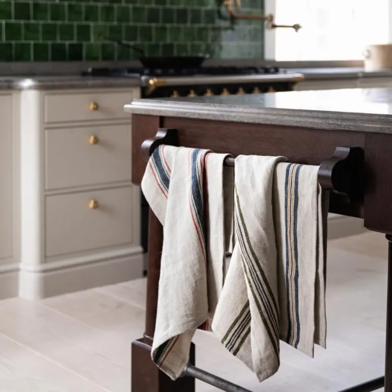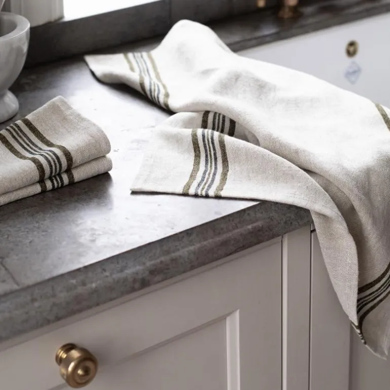 Astrid kjøkkenhåndkle 50×70 cm oliven fra Tell Me More. Kjøkkenhåndkle i 100 % europeisk lin. Linhåndkleet Astrid er i en grovere linkvalitet og har en vakker struktur med striper på langs i forskjellige størrelser. Stoffet har en vakker levende fargetone med forskjellige skift som gir et tidløst inntrykk og vil leve sesong etter sesong. Håndkleet har egenskaper som er perfekt for kjøkkentekstiler, høy sugeevne, tørker raskt, er slitesterk og varer over tid. Håndkleet er utstyrt med en hempe i det ene hjørnet. I tekstilserien Astrid finner du servietter og kjøkkenhåndklær i fargene Mustard, Navy, Olive og Red.