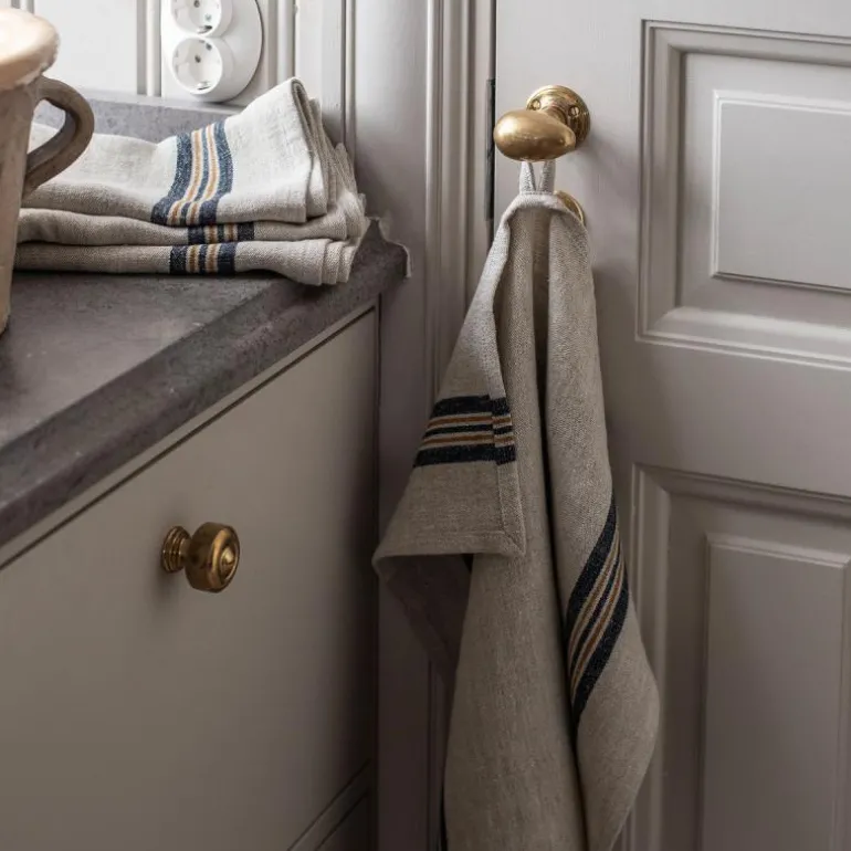 Håndkleet har egenskaper som er perfekt for kjøkkentekstiler, høy sugeevne, tørker raskt, er slitesterk og varer over tid. Håndkleet er utstyrt med en hempe i det ene hjørnet. I tekstilserien Astrid finner du servietter og kjøkkenhåndklær i fargene Mustard, Navy, Olive og Red.