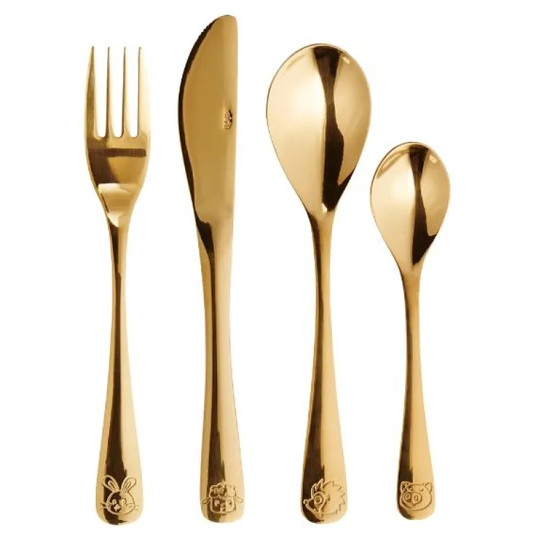 Aida mini barnebestikk gull 1 sett -nå også til de minste. Atelier 4 deler barnebestikk (mini) er enkelt og klassisk, med søte dyr inngravert, og som gjør måltidene ekstra hyggelige. De enkelte delene ligger godt i hånden. Fås i blank, gull og sort. Tåler naturligvis oppvaskmaskin.