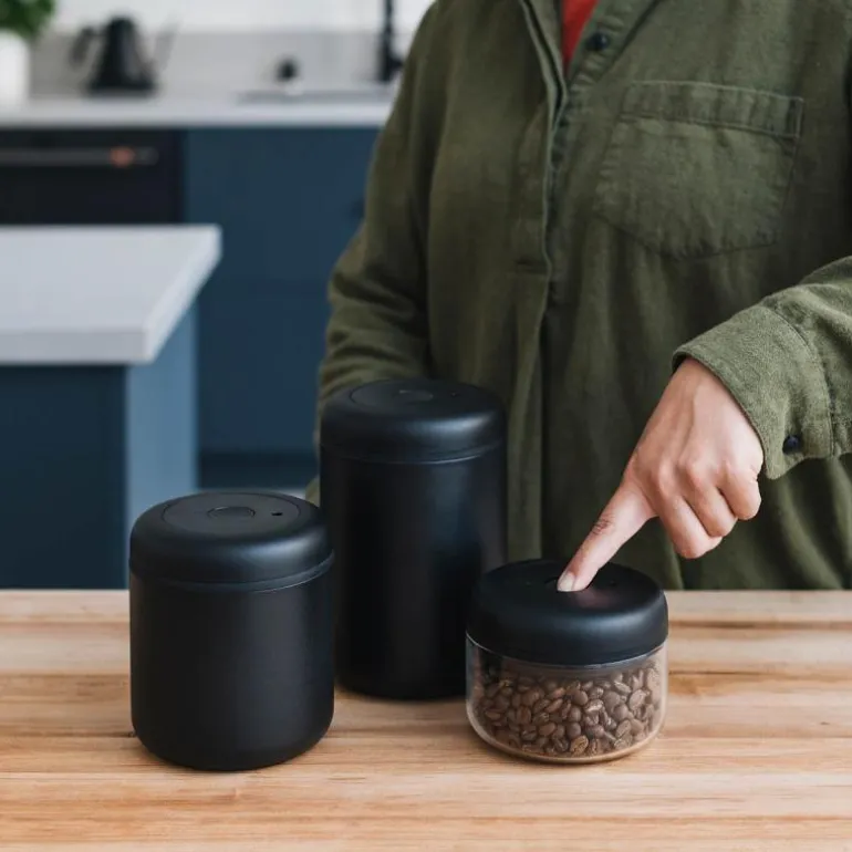 Denne lufttette kaffebeholderen har en enkel vrimekanisme for å fjerne luft og forhindre oksidering, noe som betyr at kaffen din – eller snacks, søtsaker og «urter» – varer opptil 50 % lenger.