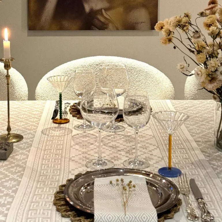 Den sjenerøse lengden på 150 cm gjør løperen velegnet til å legges langs bordets lengde for et elegant uttrykk, eller tvers over for en mer uformell oppdekking. Den delikate beige fargen skaper en nøytral bakgrunn som lett kan kombineres med andre farger og tekstiler.