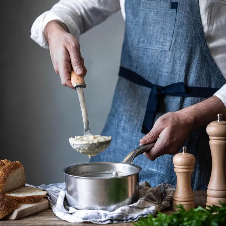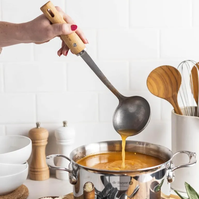 B Bois Øse kombinerer høy kvalitet, funksjonalitet og en vakker estetikk. Med en stenvasket rustfri stål skaft og skål, er denne øsen egnet for høye temperaturer. Naturlig vakker, bøkehåndtaket gir et solid grep som føles kjølig, mens den matsikre bivoksfinishen gir langvarig beskyttelse. De Buyer er en anerkjent fransk produsent av kjøkkenutstyr med en stolt historie som strekker seg tilbake til 1830. Grunnlagt i landsbyen Le Val-d’Ajol i Vosges-avdelingen, har selskapet etablert seg som en pålitelig leverandør av høykvalitetsprodukter for matlaging.