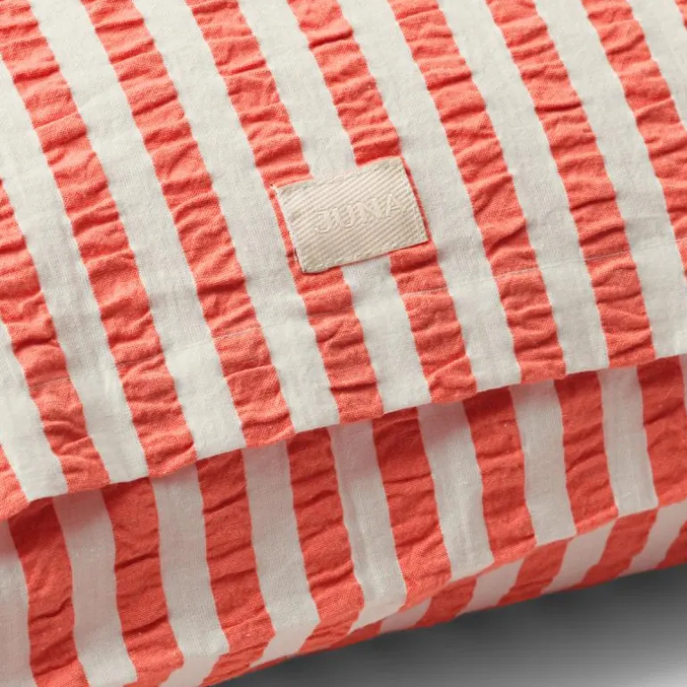 Seersucker putetrekk, Lines 70 x 50 cm chili/bjørk, fra Bæk&Bølge serien til Juna. Du tilbringer mange timer i sengen hver natt, og det betyr noe hvilke stoffer du omgir deg med. Juna-sengetøyet er laget for å være sanselig og komfortabelt, er 100 % økologisk og lar deg sovne trygt og komfortabelt hver natt og få en god natts søvn.