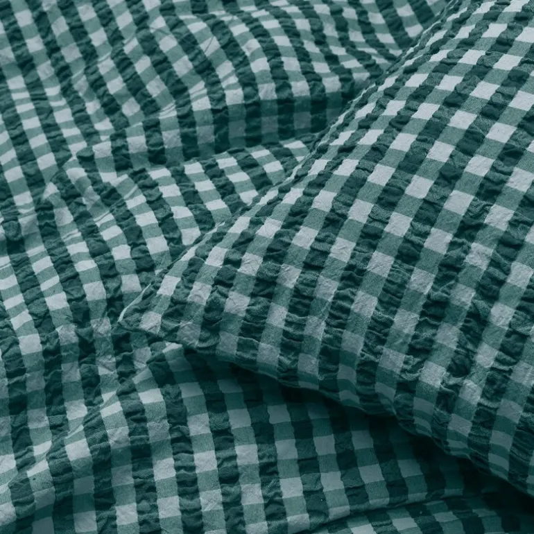Bæk&Bølge sengetøy 140×200 cm grønn/lys blå, sanselig, behagelig, 100 % økologisk. Sengetøyet Bæk&Bølge fra JUNA har en helt spesiell veving med en tekstur som vekker minner. Kanskje husker du følelsen av stoffet fra barndommen, besteforeldrene eller sommerferiene på hytta? Ikke bare er det noe nostalgisk over materialet – det er også funksjonelt og lar luften sirkulere mellom huden og stoffet.