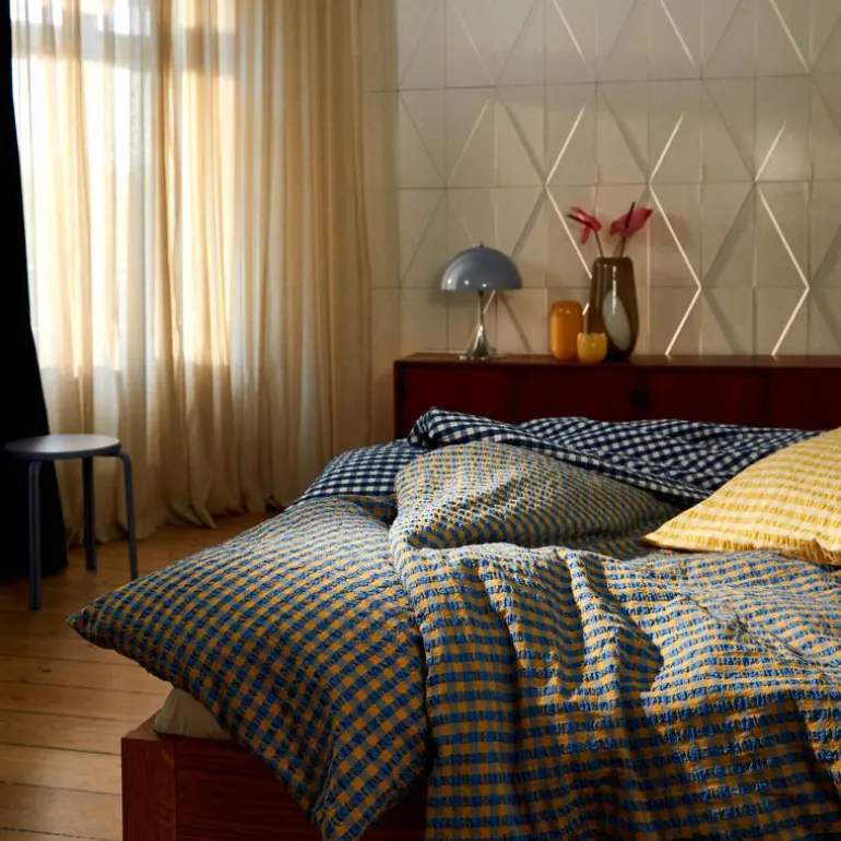 Det rutete sengesettet fra Bæk&Bølge finnes i blå/oker. Det blå har en varm, dempet friskhet, mens okeren gir en dybde og ro som minner om en tur i skogen eller på stranden en vakker høstdag. Den er laget av 100 % økologisk bomull, som er både OEKO-TEX®-merket og GOTS-sertifisert og strykefri.
