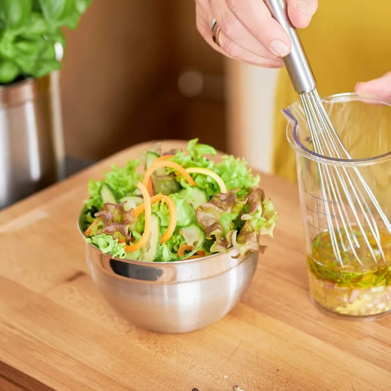 RÖSLE bolle er laget av 18/10 rustfritt stål av høyeste kvalitet, noe som gjør den ideell for både tilberedning og oppbevaring av en rekke matvarer. Denne allsidige bollen er også perfekt for servering direkte på spisebordet, takket være dens elegante design. Den praktiske hellekanten gjør det enkelt å helle uten søl. Bollen tåler oppvaskmaskin for enkel rengjøring, men bør ikke brukes i ovn.