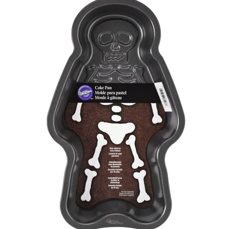 Det er enkelt å lage en morsom kake – formens hevede design etterlater innrykkede områder som kan fylles med hvit glasur for skjelettets bein.