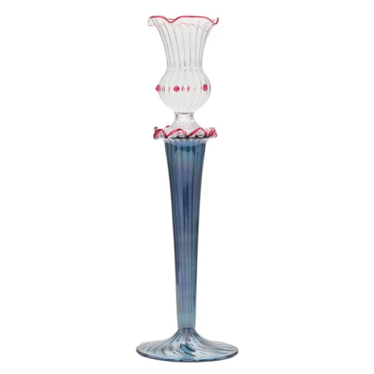 Ballerina lysestake 26 cm blå fra Moonlight Copenhagen er en elegant og grasiøs lysestake som bringer et snev av kunstnerisk skjønnhet inn i hjemmet ditt. Med sin slanke silhuett og delikate blåfarge minner den om en danser i bevegelse, og tilfører et sofistikert og stilfullt uttrykk til enhver innredning. Hver lysestake er munnblåst, noe som gjør at små variasjoner i høyde, utseende og fargetone skaper et unikt preg på hvert enkelt produkt. Denne lysestaken er spesielt designet for kronelys og passer perfekt på spisebordet, i vinduskarmen eller som en del av et dekorativt arrangement i stuen. Moonlight Copenhagen legger stor vekt på kvalitet og tradisjonelt håndverk, og hver Ballerina lysestake er laget med kjærlighet og omtanke for detaljene.