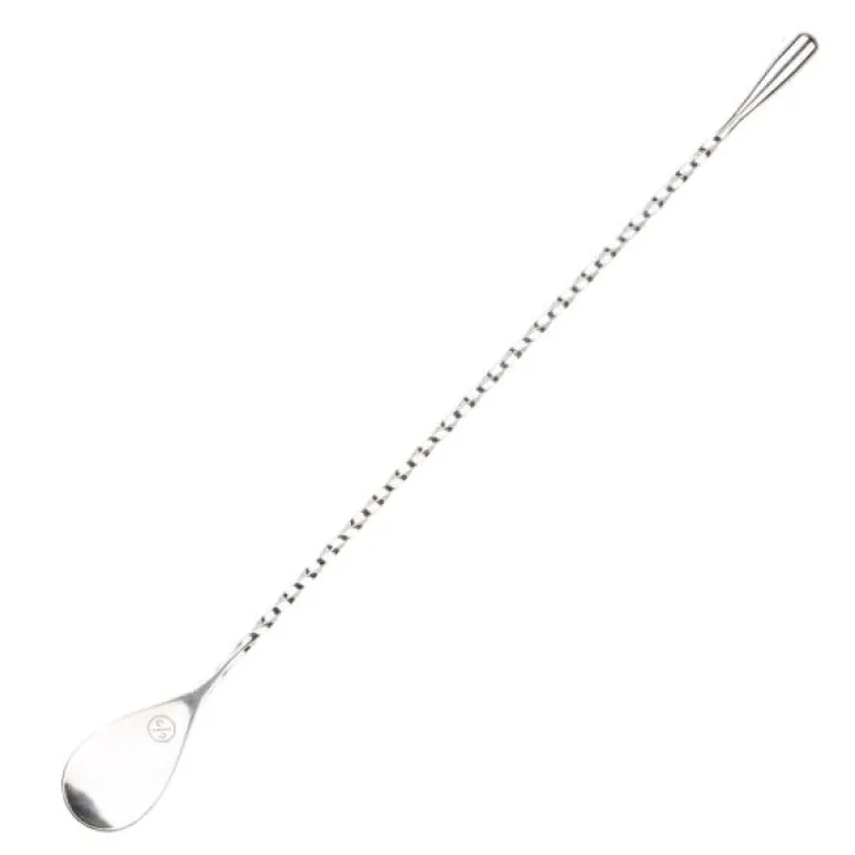 En cocktailskje 30 cm i stål, fra Cocktail Club. En cocktailskje trenger du for å kunne røre i høye drinkglass og blandeglass. Mønsteret gjør det mulig å helle væske langs skaftet, samt å skille væsker lagvis med imponerende resultater. Skjeen er lett vinklet og flink til å fange opp væske, noe som gjør den perfekt for prøvesmaking.