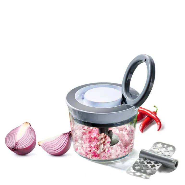 Hakk opp grønnsaker på en rask og effektiv måte ved å dra i ringen som er innfelt i lokket. Perfekt til både salater, salsa og guacomole. Du kan også røre sammen dressing ved hjelp av den medfølgende spadevispen.
