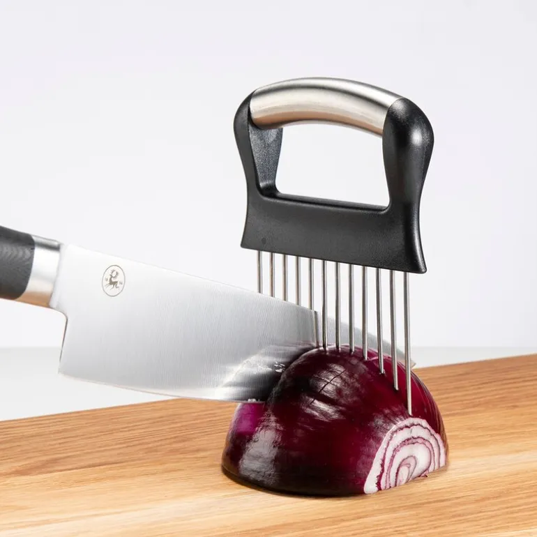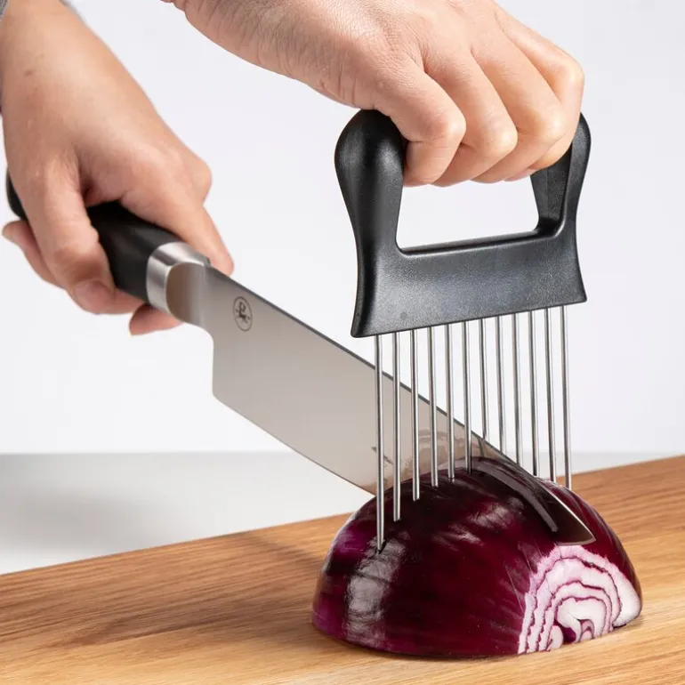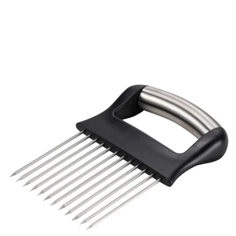 Denne praktiske løkholderen har mange bruksområder og er et smart verktøy å bruke på kjøkkenet når det er tid for å hakke og kutte løk, grønnsaker og lignende. Bruk holderen som en mal for å få jevne og fine skiver. Hjelper å holde fingrene trygge fra kniven når du hakker og skjærer. Produsert i rustfritt stål 18/8. Har et komfortabelt håndtak med godt grep og skarpe metallnåler som du enketl kan stikke inn i gjenstanden som skal holdes.