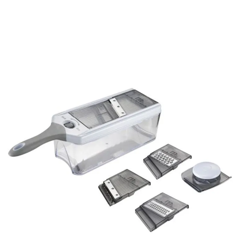 Rengjøres på øverste hylle i oppvask-maskin med program inntil 60°C. Mandolinskyveren anbefales spylt for hånd for å forhindre vannansamling i hulrom. Vis forsiktighet ved håndtering da knivbladene er svært skarpe. Inneholder fint og grov rivjern, julienne og mandolikutter. For riktig resultat er det viktig at ingredienser er ikke mer en 6 cm brede.