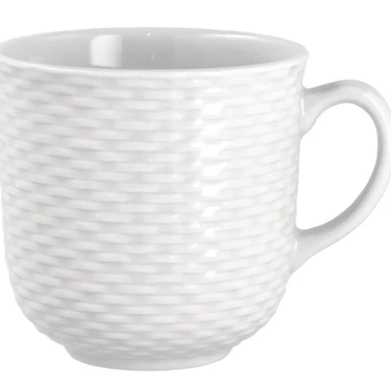 Basket krus 37 cl hvit, fra Pillivuyt. Porselensserien Basket er sprøtt, hvitt porselen med elegant dekorasjon, utført som en subtil, detaljert vev, inspirert av klassisk kurvefletting. Basket gir liv til den daglige borddekkingen, samtidig som det er elegant nok til livets spesielle anledninger.