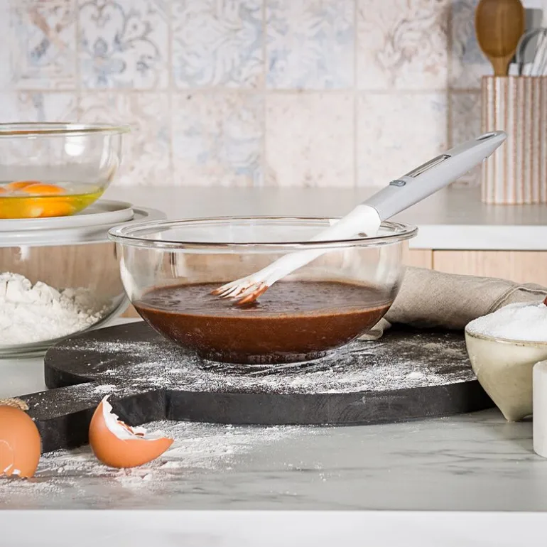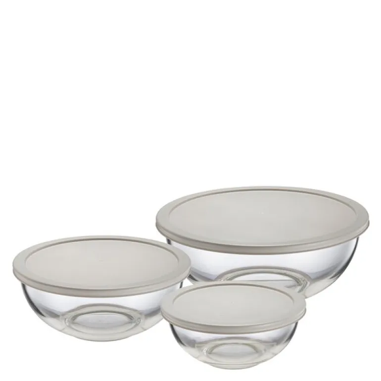bAYk bollesett fra Modern House inkluderer tre skåler i klar og lys grå på 1, 2 og 3,5 liter. Disse ildfaste glasskålene kommer med plastlokk for å sikre tett lukking, noe som holder maten fersk lenger. Skålene er svært allsidige og kan brukes til både matlaging, oppbevaring og servering. De tåler temperaturer opptil 300°C og kan fryses, men husk at lokkene ikke skal brukes i mikrobølgeovn eller stekeovn. For enkel rengjøring tåler skålene oppvaskmaskin.