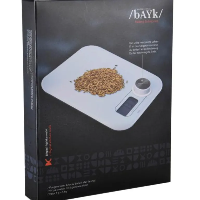 Digital kjøkkenvekt med dynamomotor som genererer strøm ved en enkel vridning av knotten. Den vil da gi nok kraft for å drive vekten i 2 minutt, uten bruk av batteri eller ladning! Veier 1g-5kg. Et grønt og miljøvennlig valg.