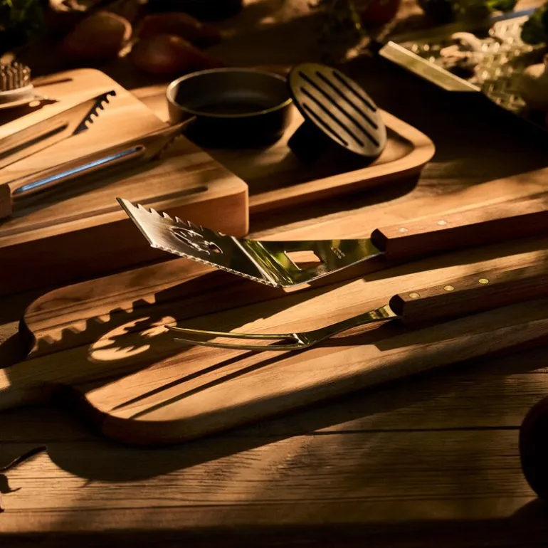 De lange, buede tindene i rustfritt stål gir et stabilt grep og gjør det enkelt å håndtere alt fra saftige biffer til store steker. Håndtaket er laget av solid naturtre og gir et komfortabelt grep, mens nitefestene i rustfritt stål sørger for ekstra holdbarhet og et gjennomført design. Med en lengde på 46 cm gir denne forskjærgaffelen en trygg avstand fra varmen, slik at du kan jobbe komfortabelt og effektivt over grillen.
