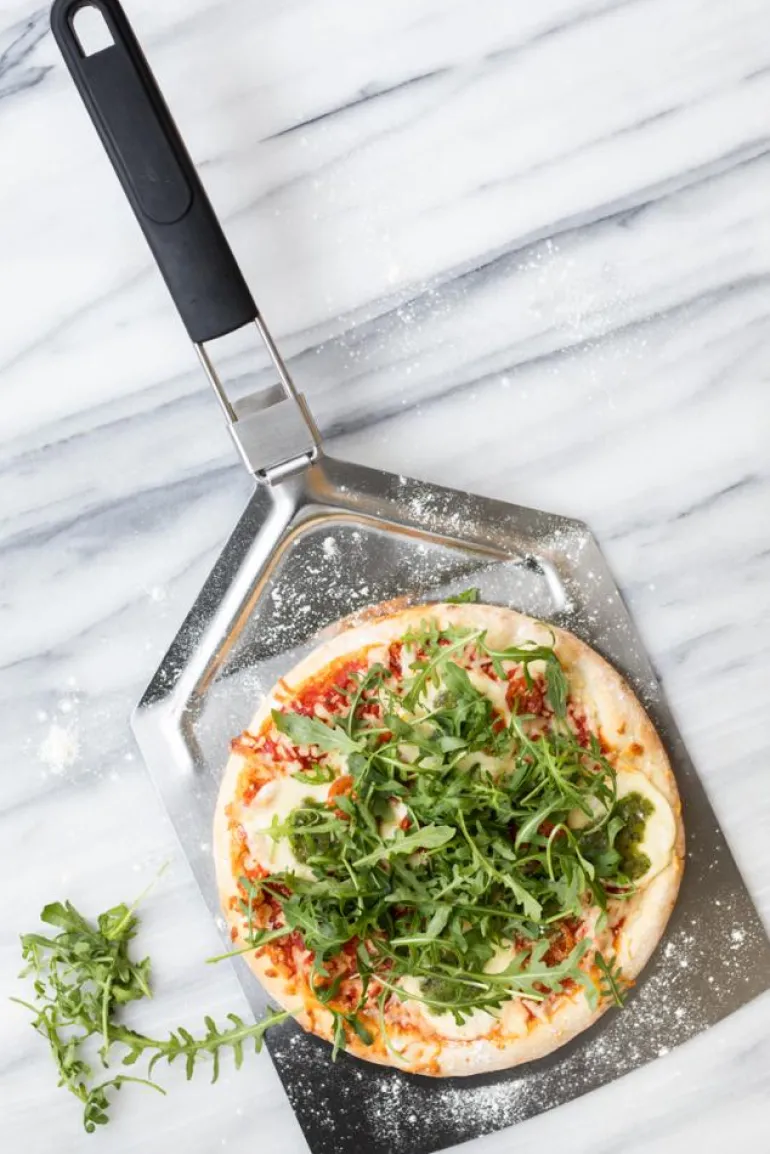 Når du lager din egen pizza må man ha en pizzaspade slik at du enkelt kan flytte pizzaen mellom pizzasteinen og tallerkenen. Den har et fleksibelt sammenleggbart håndtak for mindre oppbevaring.