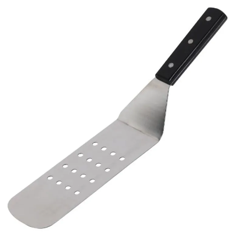 Stekespade i rustfritt stål med håndatk av bøk.Til flipping av burgere og vending av biff eller fisk. Den perforerte overflaten gjør at overflødig fett kan renne av.Rengjøres for hånd, da håndtaket kan bli mattet ned.
