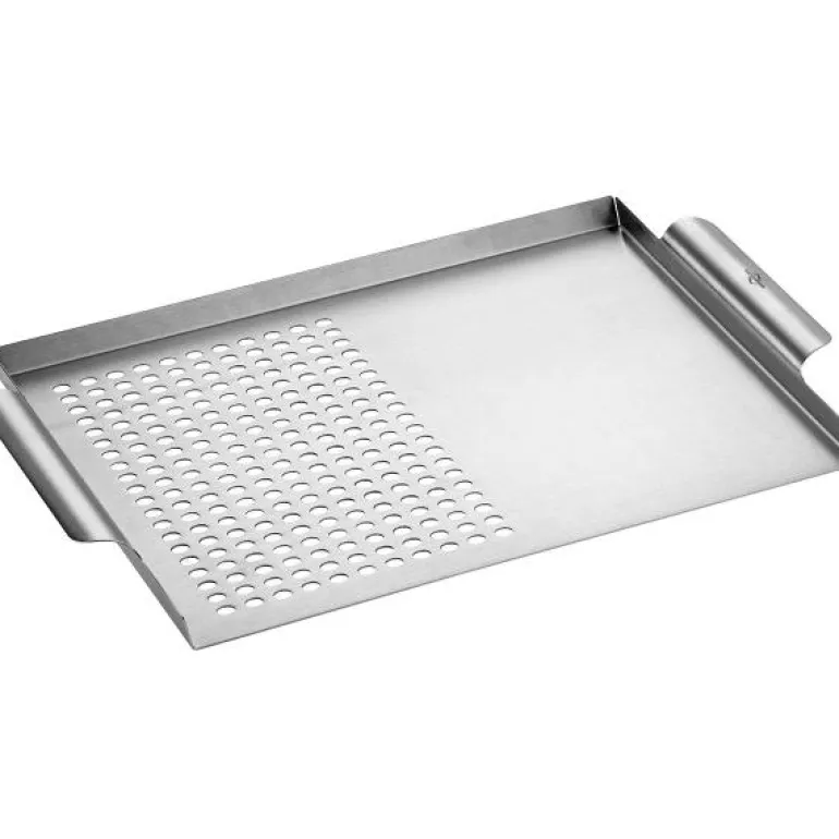 Grillplaten er perfekt hvis du ønsker grillsmaken av grønnsaker og fisk, som ofte er for liten eller fin til å kunne ligge på en vanlig grillflate. Platen er bygget opp slik at halvparten har åpninger, slik at du får optimal varmesirkulasjon og den andre halvparten er helt i stål, hvor du bl.a. kan varme små paier og annen mat. Platen kommer med praktiske håndtak og måler 38 x 21 x 3,5 cm.