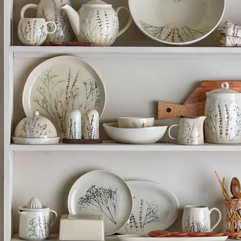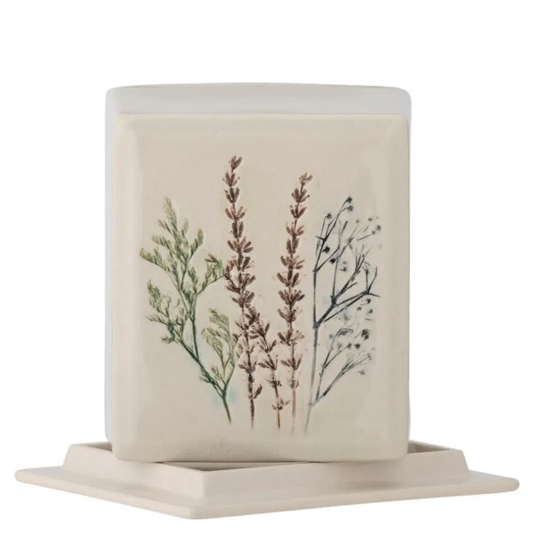 Bea smørboks 12,5×15 cm fra Bloomingville er en vakker oppbevaringsløsning laget av steintøy. Den er dekorert med et delikat, hånddekorert blomstermønster som harmonerer vakkert med den krakelerte glasuren. Hver smørboks er unik på grunn av glasurens og de håndmalte detaljenes naturlige variasjoner.