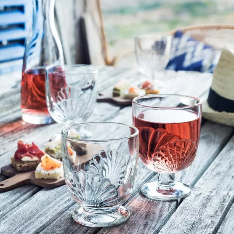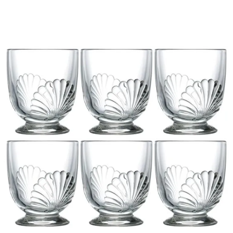 Sett med 6 glass 32 cl i Belle-Île-serien til La Rochère. De vakre glassene har fått dekor med et vakkert skjellmotiv inspirert av de nydelige strendene i Bretagne. Glasset er utmerket til kalde drikker juice eller vann, og perfekt til servering av desserter som pannacotta, ostekake eller andre små desserter som passer seg i glass.
