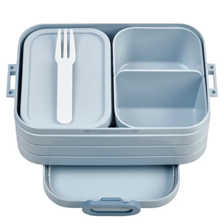 Matboksen er utstyrt med to bentobokser med lokk og en praktisk fruktgaffel, slik at maten holdes adskilt og smakene bevares. Bento, inspirert av den japanske tradisjonen, er designet for å oppbevare ulike typer mat i separate beholdere, noe som gjør den ideell for variert og balansert lunsj på farten.