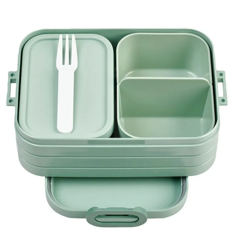 Matboksen er utstyrt med to bentobokser med lokk og en praktisk fruktgaffel, slik at maten holdes adskilt og smakene bevares. Bento, inspirert av den japanske tradisjonen, er designet for å oppbevare ulike typer mat i separate beholdere, noe som gjør den ideell for variert og balansert lunsj på farten.