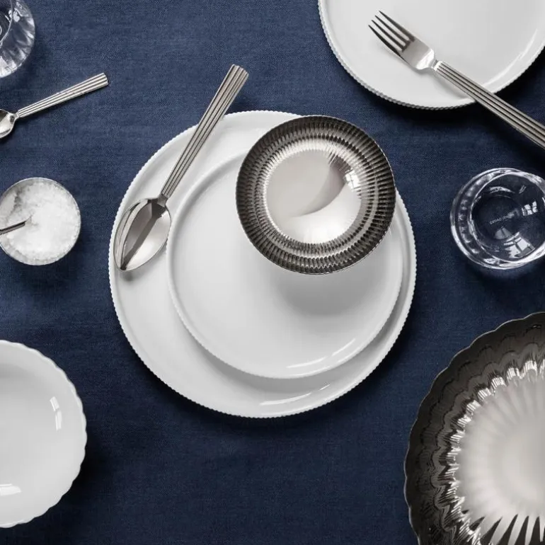 Bernadotte serviset fra Georg Jensen lar deg dekke bord i moderne minimalisme og et streif av art deco-stil, som kollektionen har røtter fra. De ikoniske rillene fra Bernadotte kolleksjonen rammer inn asjetten og danner en elegant kontrast til den runde formen. Størrelsen er perfekt til lunsj eller salat, og tallerkenen er både elegant i seg selv og i kombinasjon med kolleksjonens middagstallerkener, skåler og glass.