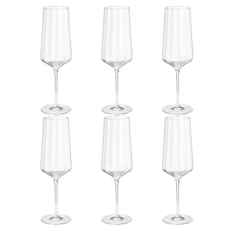 Laget av krystallglass, har hvert glass en kapasitet på 27 cl og er formet med tanke på både estetikk og funksjon. Enten det er nyttår, jubileum eller et spontant øyeblikk som fortjener å feires, gir disse seks glassene en raffinert ramme for din skål.