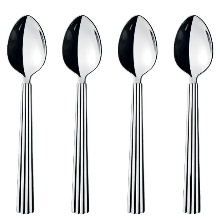 Fire kaffeskjeer i Bernadotte-serien til Georg Jensen. Med sine grafiske bølgende Art Deco-former og vakre proporsjoner har Bernadotte bestikk bestått tidens prøve og blitt en ekte klassiker.