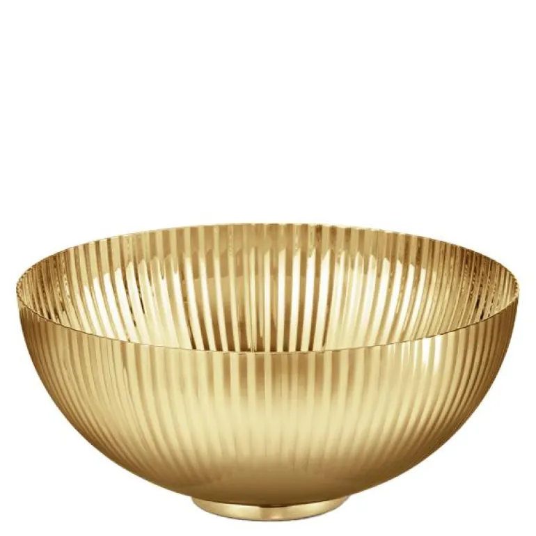 Vakker skål, Bernadotte gull, fra Georg Jensen. Med de distinkte rillene fra det originale 1930-talls sølvtøyet, utviklet av designer Sigvard Bernadotte, er denne store serveringsbollen et vakkert midtpunkt på middagsbordet. Mesterlig utformet i skinnende gullbelagt rustfritt stål er denne skålen et uttrykk for klassisk skandinavisk design på sitt mest tidløse.