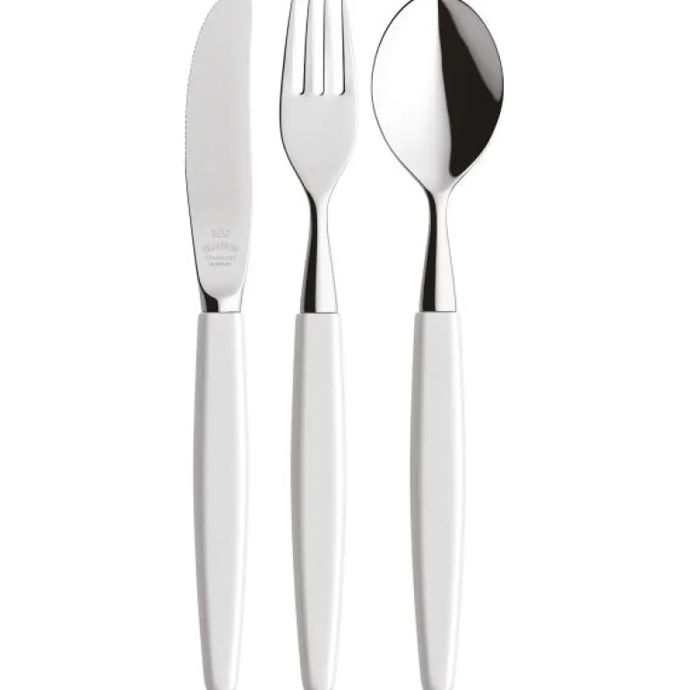 Bestikksett 18 deler hvit. Skaugum bestikk med hvitt skaft er en klassiker! Dette bestikksettet består av 6 stk spiseskjeer, 6 stk spisegafler og 6 stk spisekniver. Settet blir levert i en pen gaveeske. Skaugum Bestikks kronelogo er deres garanti for at du holder et håndlaget, norsk kvalitetsbestikk. Bordknivene er smidde, som gir en skarphet og kvalitet som ingen andre produksjonsmetoder klarer. I tillegg til kniv, skje og gaffel har vi et bredt utvalg av andre deler, som for eksempel kakespade, salatbestikk og ostehøvel. Bestikket er produsert i rustfritt stål med 18/8-kvalitet. Skaugum Bestikk i hvitt og sort kan vaskes i maskin. Vi anbefaler at du alltid skyller bestikket før du setter det i maskinen, bruk gjerne finvaskprogram. Skaugum sine bestikk har sett like ut helt siden starten i 1943. Skaugum lager sine bestikk for hånd, som er en spennende og tidkrevende prosess. Stålet varmes opp til 1035 grader før vi slår med en hydraulisk hammer ned i ønsket form. Våre plastskaft blir støpt mens treskaftene sages og freses. Vi skjefter, polerer, og borer hver del for hånd på maskiner fra en annen tidsalder.