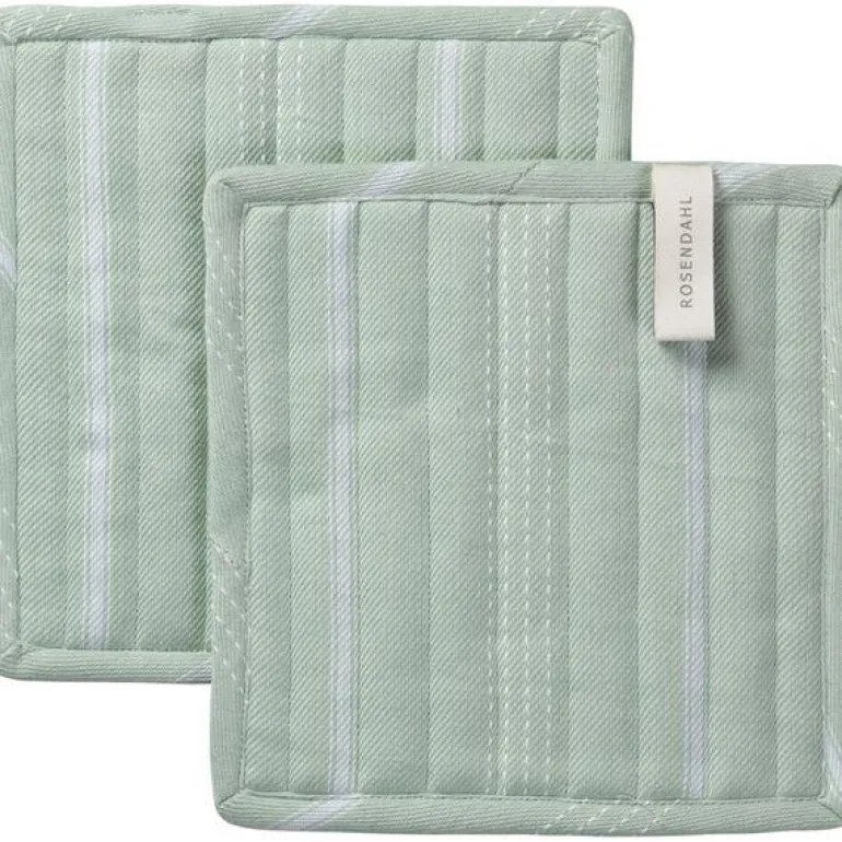 Beta er en 2-pakning med grytekluter i 100 % økologisk bomull. Gryteklutene måler 22 x 22 cm, og er fôret med polyester som tåler varme opptil 220° grader. Beta grytekluter løfter umiddelbart ethvert kjøkken, med et klassisk og elegant vevd stripete motiv i mint med hvit kontrastfarge. Produktet kan vaskes på 40°, og overholder PPE-forskriften (EU)2016/425