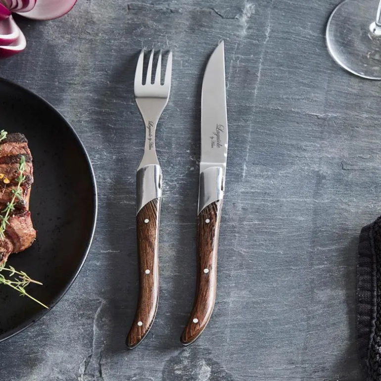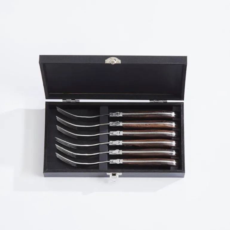 Laguiole er navnet på den spesielle formen som knivene og gaflene har. Navnet kommer fra en fransk by.Gaflene er laget av 420 rustfritt stål og merket med en logo. Settet består av 6 biffgafler med skaft i wengetre, og kommer i en svart gaveeske i tre.Det finnes også matchende kniver.