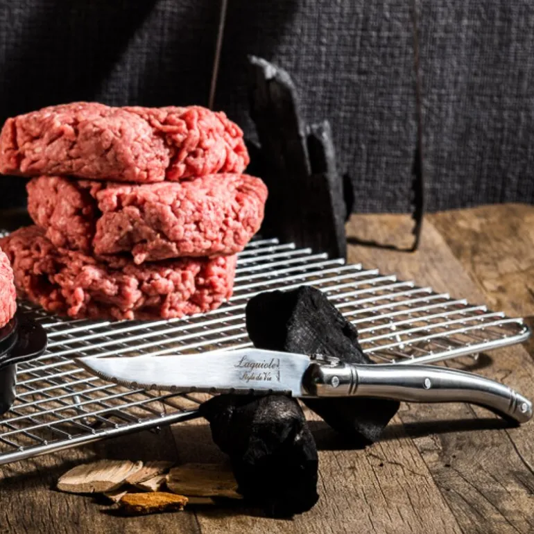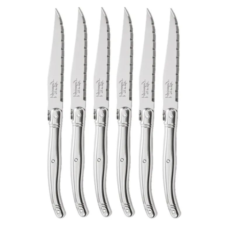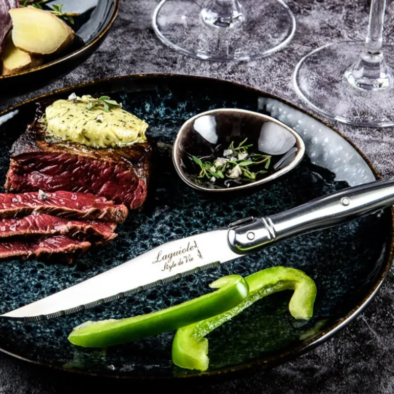 Laguiole Style de Vie Premium Line biffkniver i rustfritt stål leveres i sett à seks, og er et pålitelig verktøy ved kjøttservering. Knivene er 23 cm lange og har taggete blader i rustfritt stål med en tykkelse på 1,8 mm – perfekt for å skjære biff og annet kjøtt på en effektiv måte.