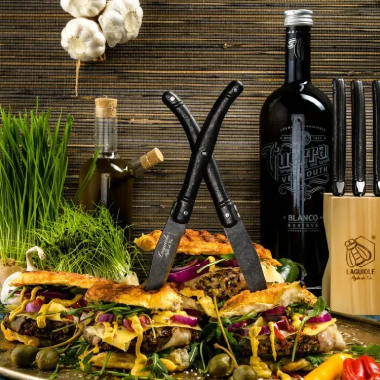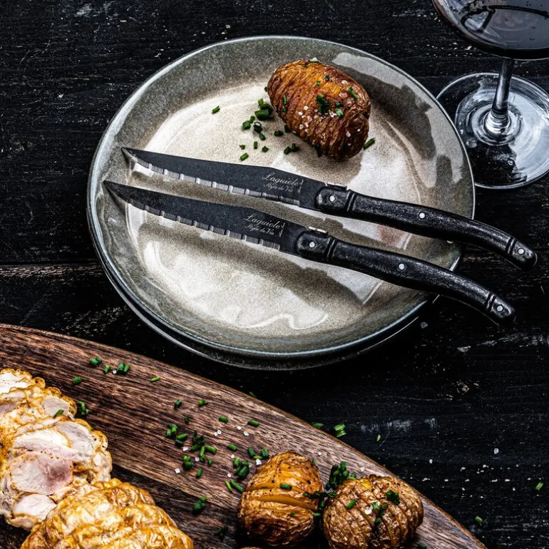 Dette settet med biffkniver fra Laguiole Style de Vie Premium Line består av seks solide kniver i rustfritt stål med en mørk stonewash-finish. Bladene er 23 cm lange, taggete og har en tykkelse på 1,8 mm – utviklet for å kutte kjøtt effektivt og presist.