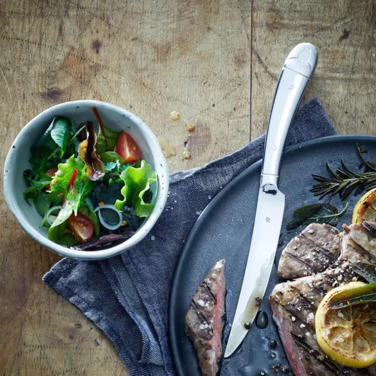 De smidde knivene har et ekstremt skarpt blad laget av spesialbladstål. Den takkete kanten skjærer enkelt gjennom biffens sprø stekeskorpe og glir gjennom tykke kjøttutskjæringer som smør. De som elsker en saftig biff, liker å spise den med skarpt bestikk. Biffbestikk har en takket kniv med et ekstremt skarpt blad laget av spesialbladstål. Det skjærer gjennom biffens sprø stekeskorpe og glir gjennom tykke kjøttutskjæringer som smør.