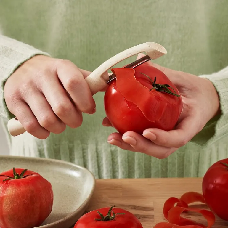 Det ergonomiske håndtaket gir komfort under bruk, og bidrar til at skrelleren ligger godt i hånden selv ved lengre matforberedelser. Dette gjør den godt egnet til alt fra poteter til gulrøtter og frukt.