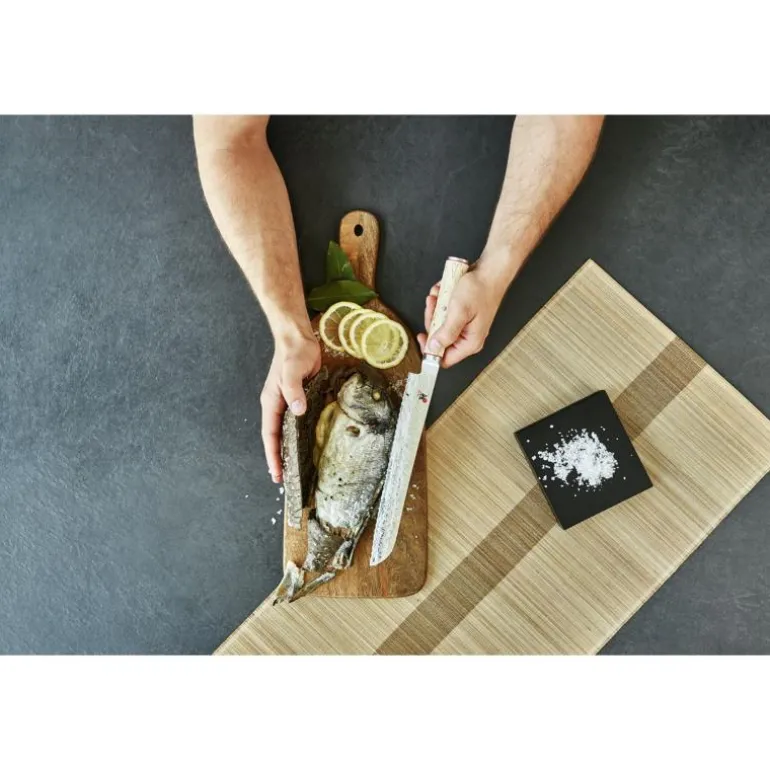 Birch 5000 MCD brødkniv fra Miyabi er en 23 cm lang kniv utformet for å skjære gjennom brød uten å klemme det sammen. Den tannede eggen gjør det enkelt å kutte gjennom harde skorper samtidig som brødets struktur bevares. Kniven egner seg også godt til andre råvarer med hard overflate, som ananas eller melon, der en ekstra skarp og kraftfull egg er nødvendig.