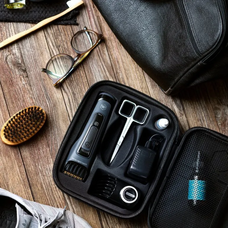 Trimmerens selvslipende titanblader gir presis trimming med 44 ulike lengdeinnstillinger, og passer like godt til kort som langt skjegg. Med litium-ion-batteri får du 120 minutter trådløs bruk, og mulighet for drift med ledning. Børsten i ekte naturbust reduserer frizz og er ideell for styling, mens bartesaksen i rustfritt stål gir rene snitt.